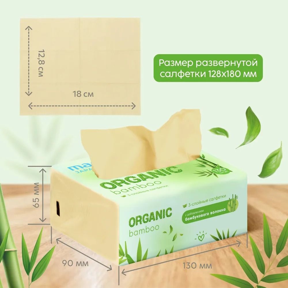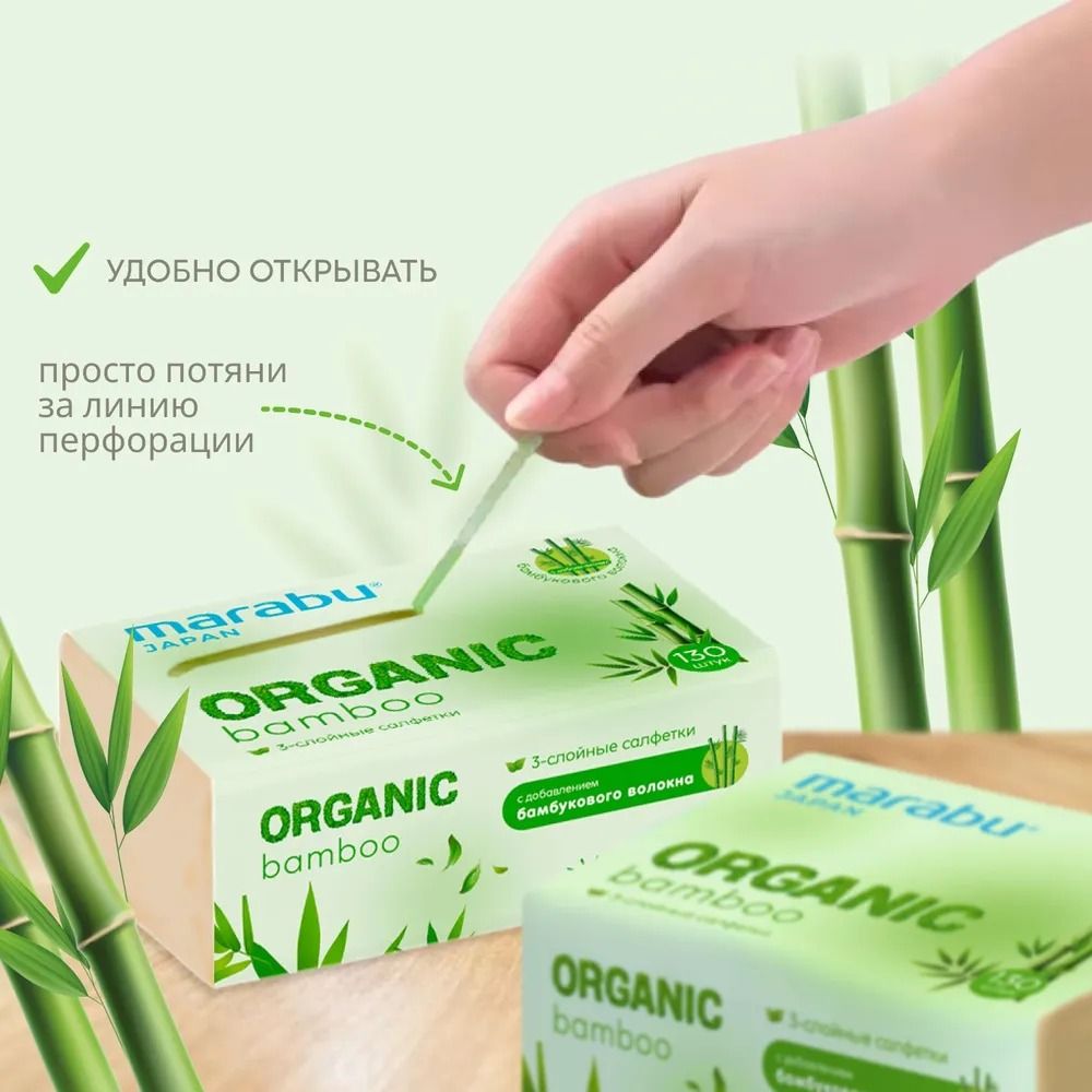 Салфетки бумажные сухие ORGANIC bamboo трехслойные в мягкой упаковке! Исключительная мягкость бумажных салфеток японского бренда Marabu с добавлением бамбукового волокна! Гипоаллергенные 3-х слойные салфетки сухие станут вашим незаменимым помощником, защитят самую чувствительную кожу от раздражения, даже при сильном насморке и частом использовании.