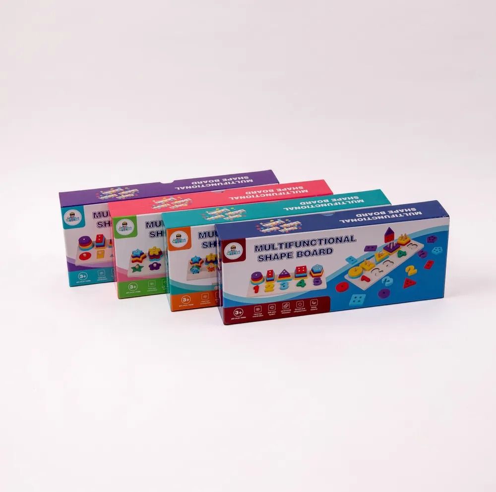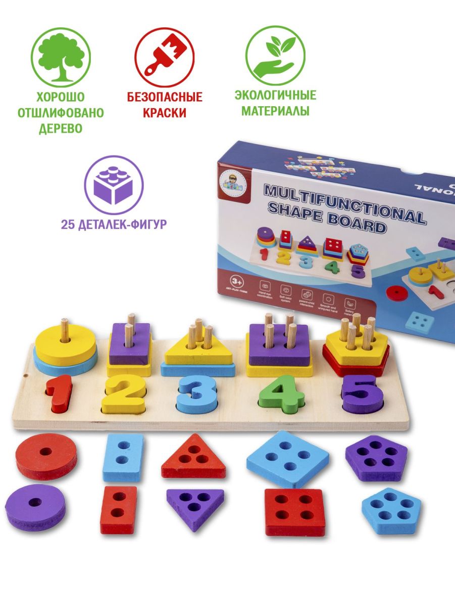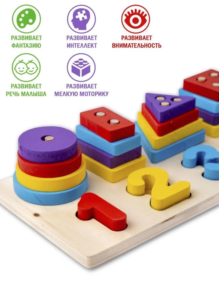 Задача малыша — правильно подобрать и надеть фигурки на столбики. Кроме того, детали можно использовать как счётный материал или попросить ребёнка разложить их по цветам. Эта увлекательная головоломка развивает пространственное мышление, цветовое восприятие, логику и мелкую моторику рук, она познакомит ребёнка с миром геометрических фигур и цифр от 1 до 5.