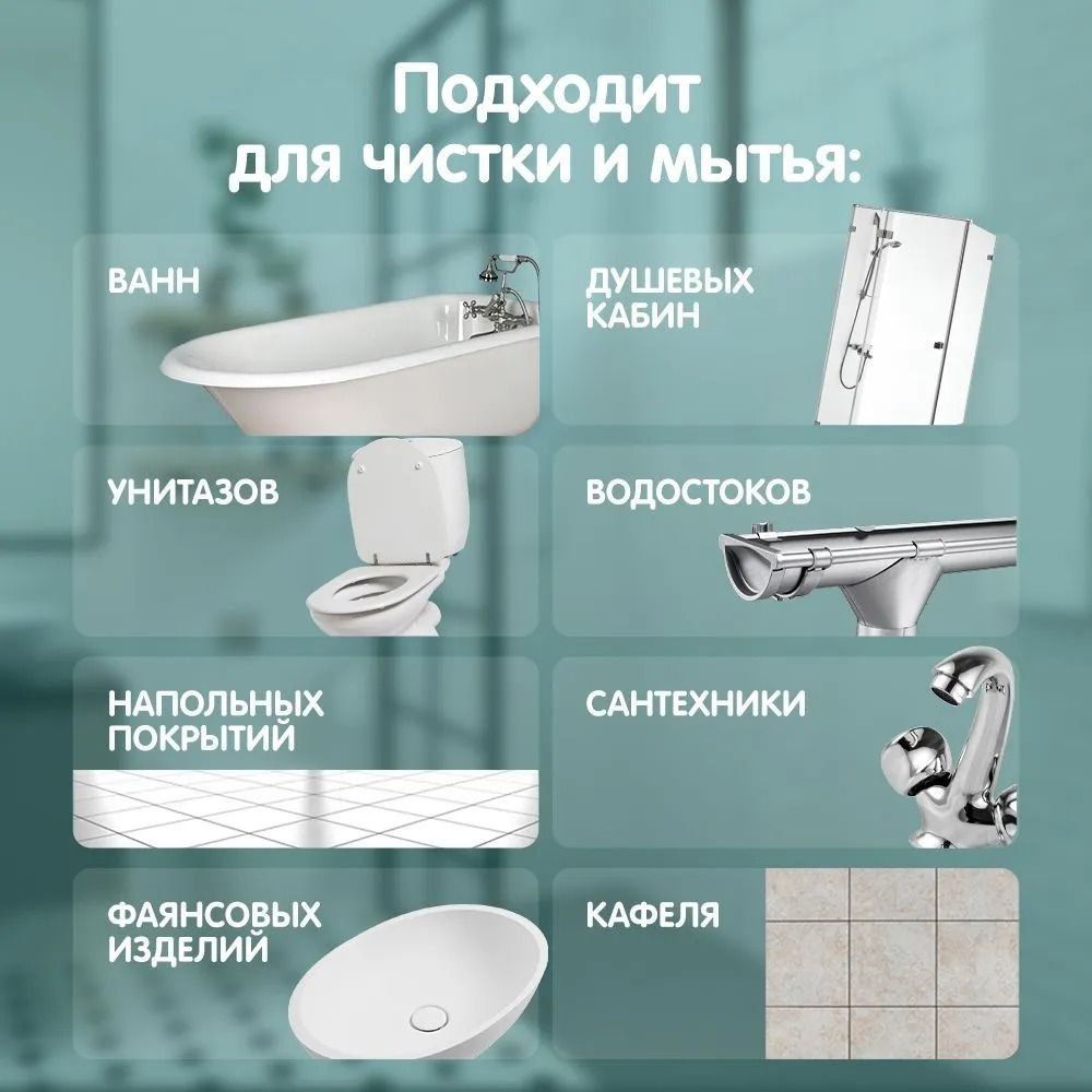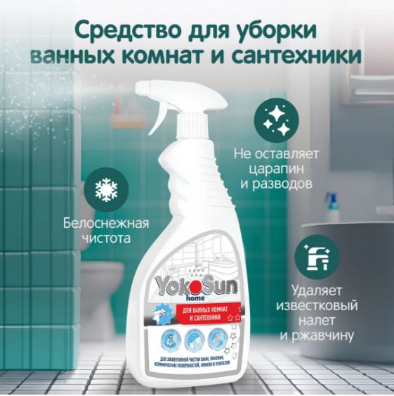 Чистящее средство для ванных комнат и сантехники YokoSun. Высокоэффективное средство для чистки акриловых и пластиковых ванн, джакузи, раковин, хромированных кранов, унитазов и кафельных покрытий. Средство бережно очищает от мыльных разводов, известкового налета, ржавчины, плесени и грибка. Не оставляет царапины, придает блеск поверхности. Подходит для ежедневной уборки.