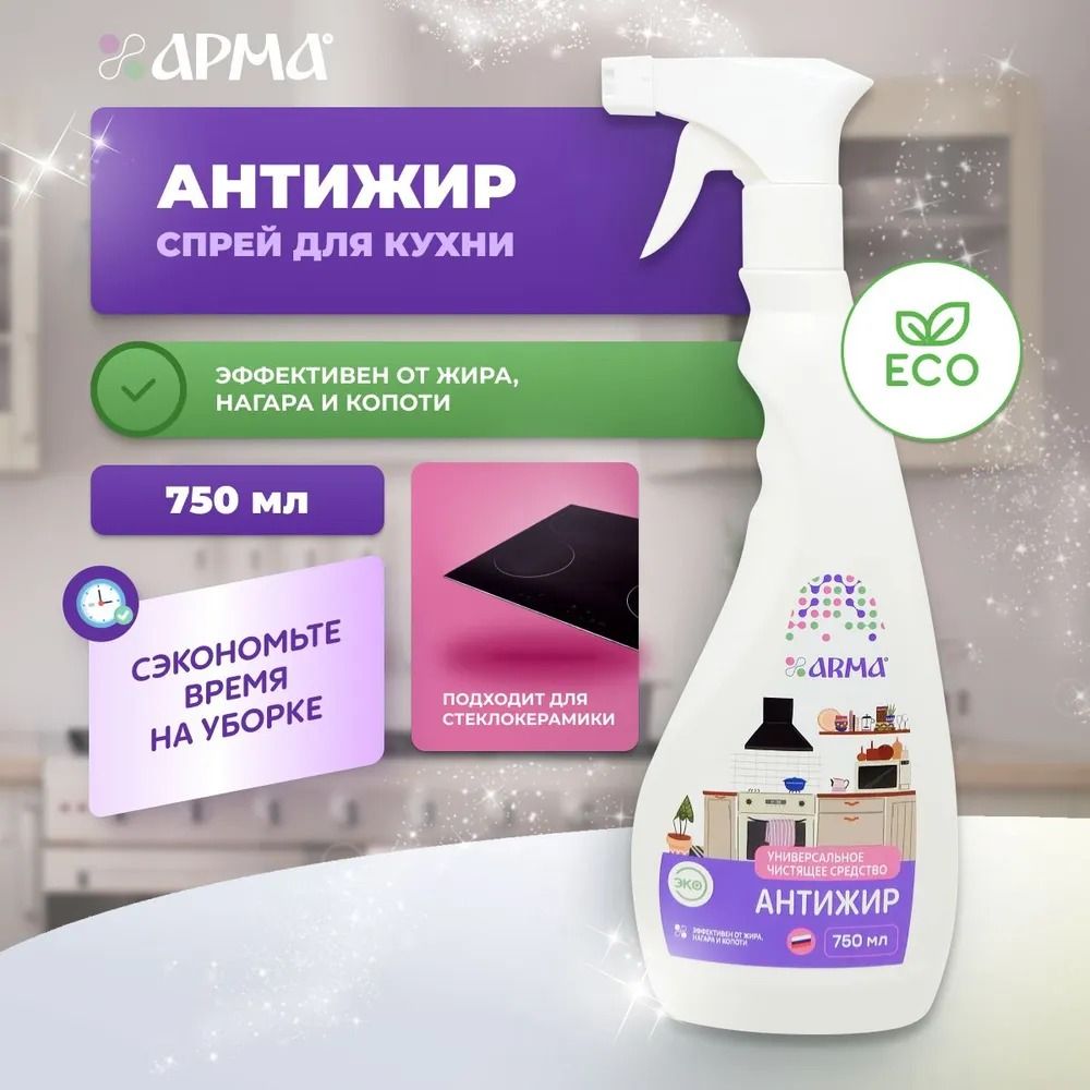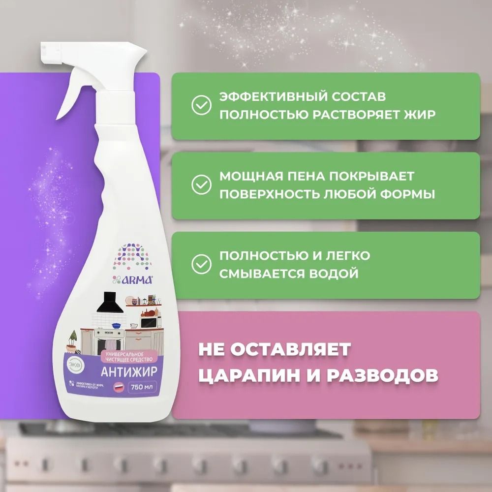 Универсальное чистящее средство "Антижир" Арма - ваш надежный союзник в борьбе с загрязнениями на кухне. Это не просто спрей, а настоящий защитник, который поможет вам сохранить чистоту и блеск.