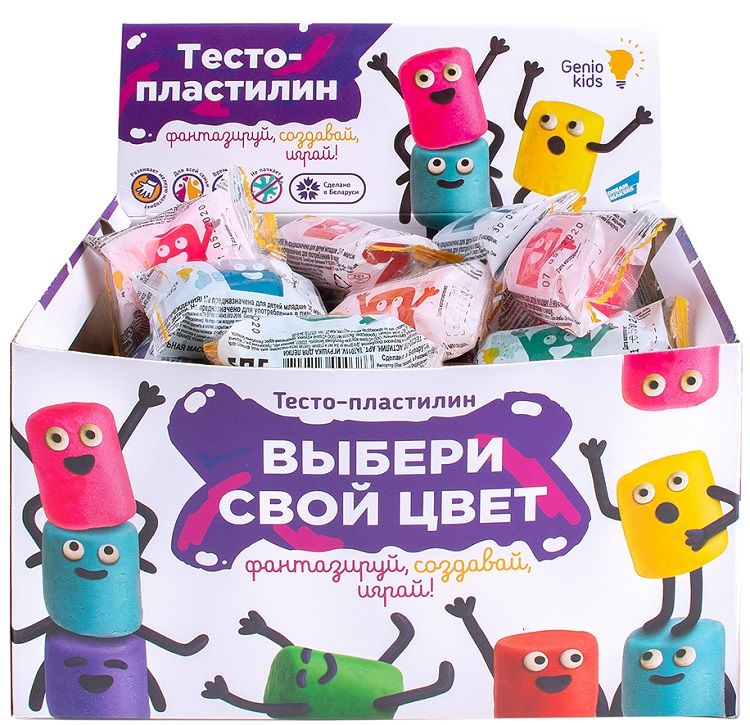 Набор расходников теста-пластилина в отдельных пакетиках в шоубоксе. Для детей от 3-ех лет и старше. Состав теста-пластилина: мука, вода, крахмал, соль, ароматизатор, краситель. Состав набора: тесто-пластилин 8 цветов, по 50 гр. , 60 пакетиков в шоубоксе.