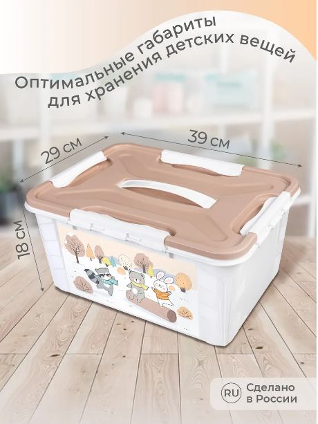 Особая крышка может открываться откидным способом, а может сниматься полностью. Крышка плотно фиксируется с помощью четырех замков по периметру. Благодаря удобной прочной ручке коробку можно переносить с места на место. Специальная выемка на крышке позволяет спрятать ручку для штабелирования коробок. Декор нанесен с помощью технологии IML: он не стирается и не повреждается в процессе использования. Ящик изготовлен из безопасного полипропилена, не имеет острых углов.